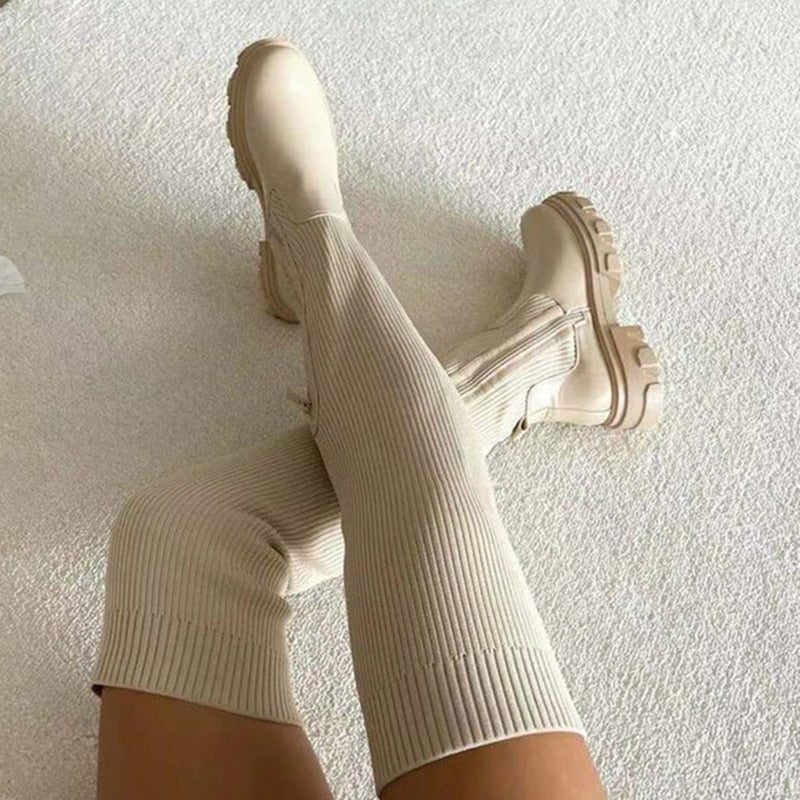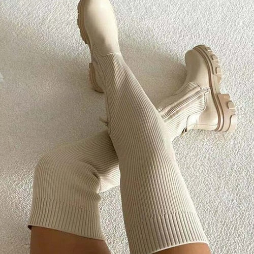 2023 النساء حذاء برقبة للركبة الخريف المرأة تمتد بولي PU محبوك أحذية طويلة امرأة منصة مسطحة الشتاء السيدات حذاء بسحاب حجم كبير